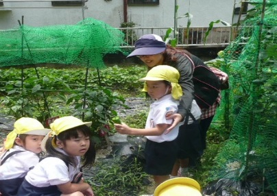 協調・思いやりのある子ども一定の決まりの中でわがままを抑え友だちと仲良く遊べる子ども ![]() ピーマンの世話をして優しい気持ちを培う。